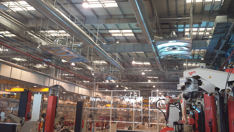 此项目为机器人焊接除尘,区域内分布6台动臂焊接机器人,每台机器人焊接空间在L=5m,W=2m,H=2m范围,起焊在2.5米以上高度。结合客户需求,在满足采光的条件下做透明幕墙,且避免对现场设备作业的干扰,采用半密闭的焊接除尘工作间进行治理,同时在行车顶部对应每个机器人焊接位置,做吸尘罩,不影响工件吊装。下部利用3米高物流通道自然进风,不影响人员进出及小件移动。2套净化设备放置在焊接区域一端主控台左右,底部做钢平台,同主控台底高一致,经净化后空气,室内排放。经业主采集数据证明,采用此方法除尘效率,是局部捕捉方式的20倍。