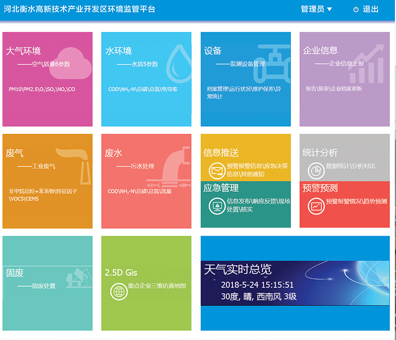 衡水高新区环境监管平台是以监测为手段,通过对实时数据的处理、分析实现预警功能。并通过对园区内废气、废水、危废情况进行实时显示、数据存储,建设信息资源整合共享机制和有关信息设施,让园区管理人员能够快速反应。