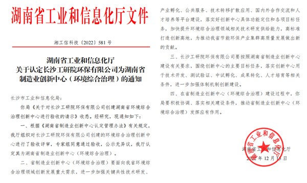12月16日,湖南省工业和信息化厅发布关于认定长沙工研院环保有限公司为湖南省制造业创新中心(环境综合治理)的通知(湘工信科技〔2022〕581 号 ),工研院创建的环境综合治理创新中心通过了专家组验收,且公示无异议,认定为湖南省制造业创新中心(环境综合治理)。