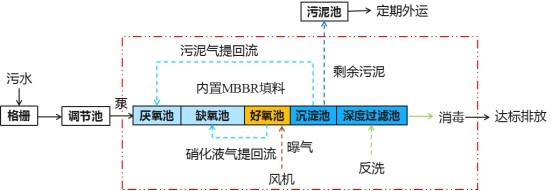 农村污水厌氧-缺氧-好氧-移动床生物膜反应器一体化处理设备采用A2O+MBBR工艺,利用厌氧、缺氧、好氧生物膜工艺,采用双泥龄法,脱氮除磷效果显著,其中COD去除率≥85%、BOD去除率≥90%、SS去除率≥90%、氨氮去除率≥85%。本项技术在污水处理项目中的投入运用,所收集的污泥定期外运交予有处理资质的单位进行无害处理,不产生二次污染。