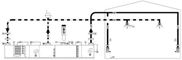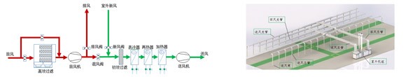 系统通过回风口捕捉车间内含有焊接烟尘的污染空气,经回风机吸入至空气处理机组进行过滤除尘、制冷除湿(夏季)、加热(冬季)处理后,由送风机送入车间内,同时系统可根据季节的不同,提供一定量的新风送入室内,从而满足车间工艺生产所需的温湿度控制环境,改善车间内空气品质。系统运行后,厂房内4m以下工作区域空气的清洁度达到《工业企业设计卫生标准(GBZ1-2010)及《工业场所有害因素职业接触限值》(GBZ2-2007)的规定,即铝粉尘浓度≤3mg/m3,碳钢焊接烟尘≤4mg/ m3;铝合金车体焊接厂房内4m以下工作区域冬季温度≥16℃,夏季温度≤30℃,全年相对湿度≤60%;碳钢车体厂房内4m以下工作区域冬季温度≥16℃;烟气净化后排放浓度及排放速率符合《大气污染物综合排放标准》(GB16297-1996)要求。