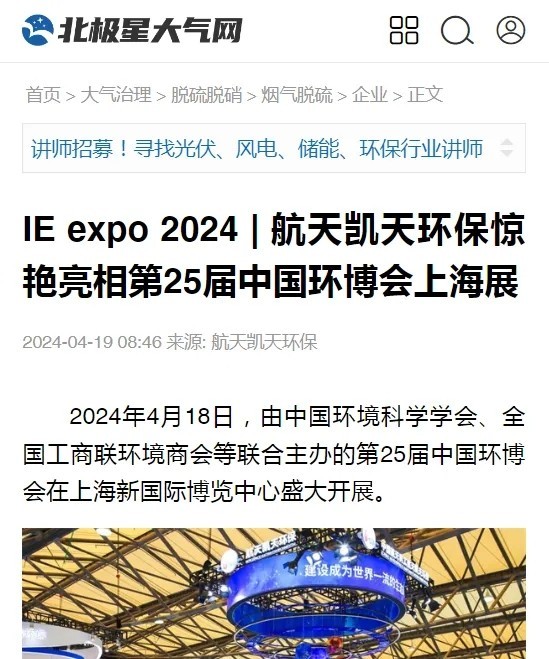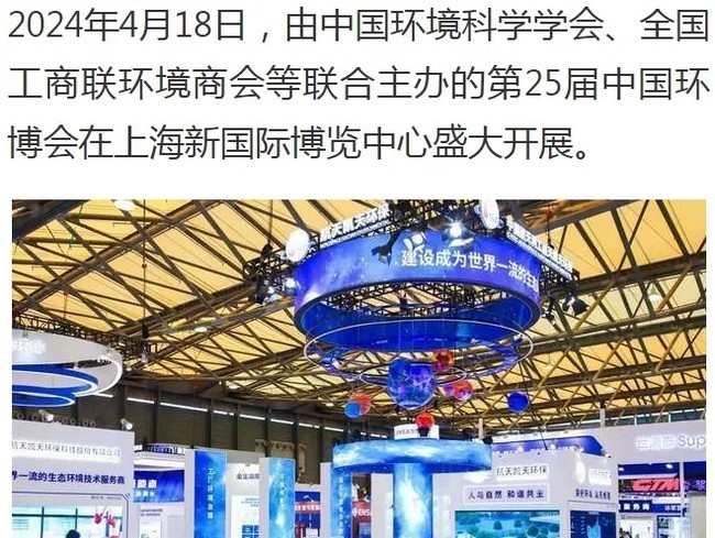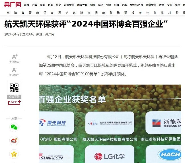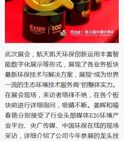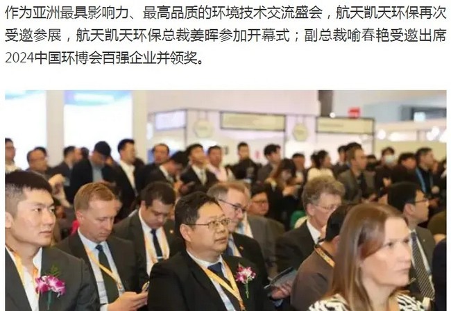 4月18日,由中国环境科学学会、全国工商联环境商会等联合主办的第25届中国环博会在上海新国际博览中心盛大开展。航天凯天环保再次受邀参展,航天凯天环保总裁姜晖参加开幕式;副总裁喻春艳受邀出席2024中国环博会百强企业并领奖。受到了众多媒体的广泛关注和报道。