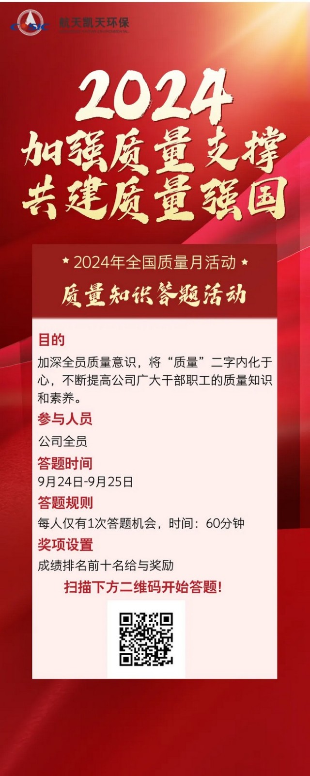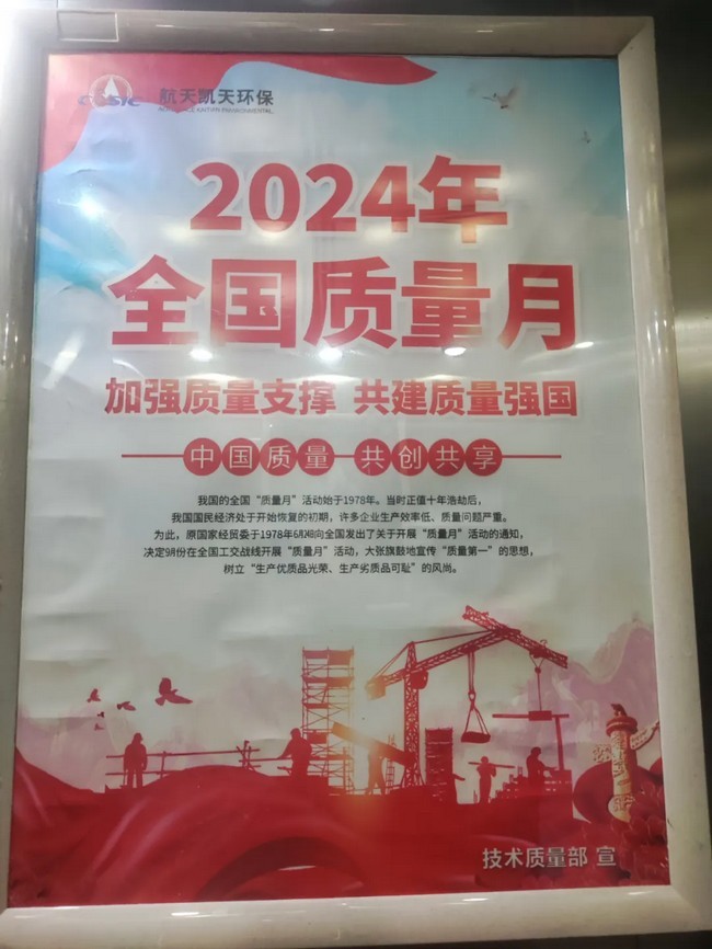 2024年9月是第47个全国“质量月”,为全面贯彻党的二十届三中全会精神,助力质量建设,营造人人重视质量、追求质量、崇尚质量、关心质量的良好氛围。航天凯天环保开展以“加强质量支撑,共建质量强国”为工作主题的质量月系列活动,旨在不断提高各事业部的质量管理意识和实体工程质量。