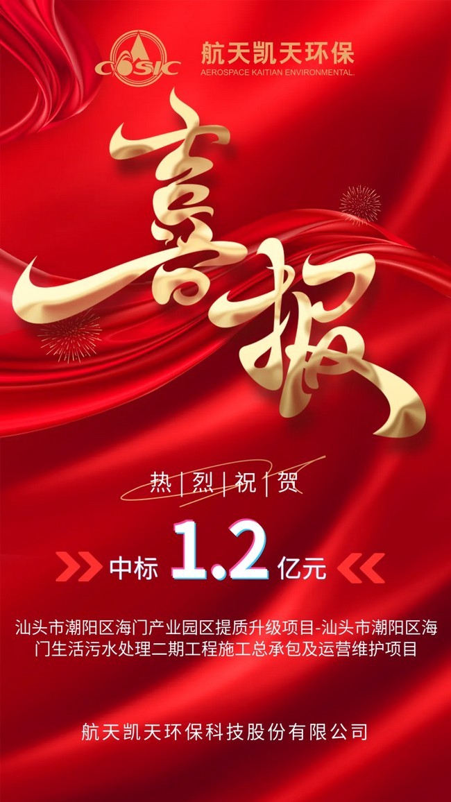 6月17日,航天凯天环保科技股份有限公司牵头揭阳市航天凯天生态治理有限公司及达濠市政建设有限公司成功中标“汕头市潮阳区海门产业园区提质升级项目-汕头市潮阳区海门生活污水处理二期工程施工总承包及运营维护项目”,中标金额约1.2亿元。